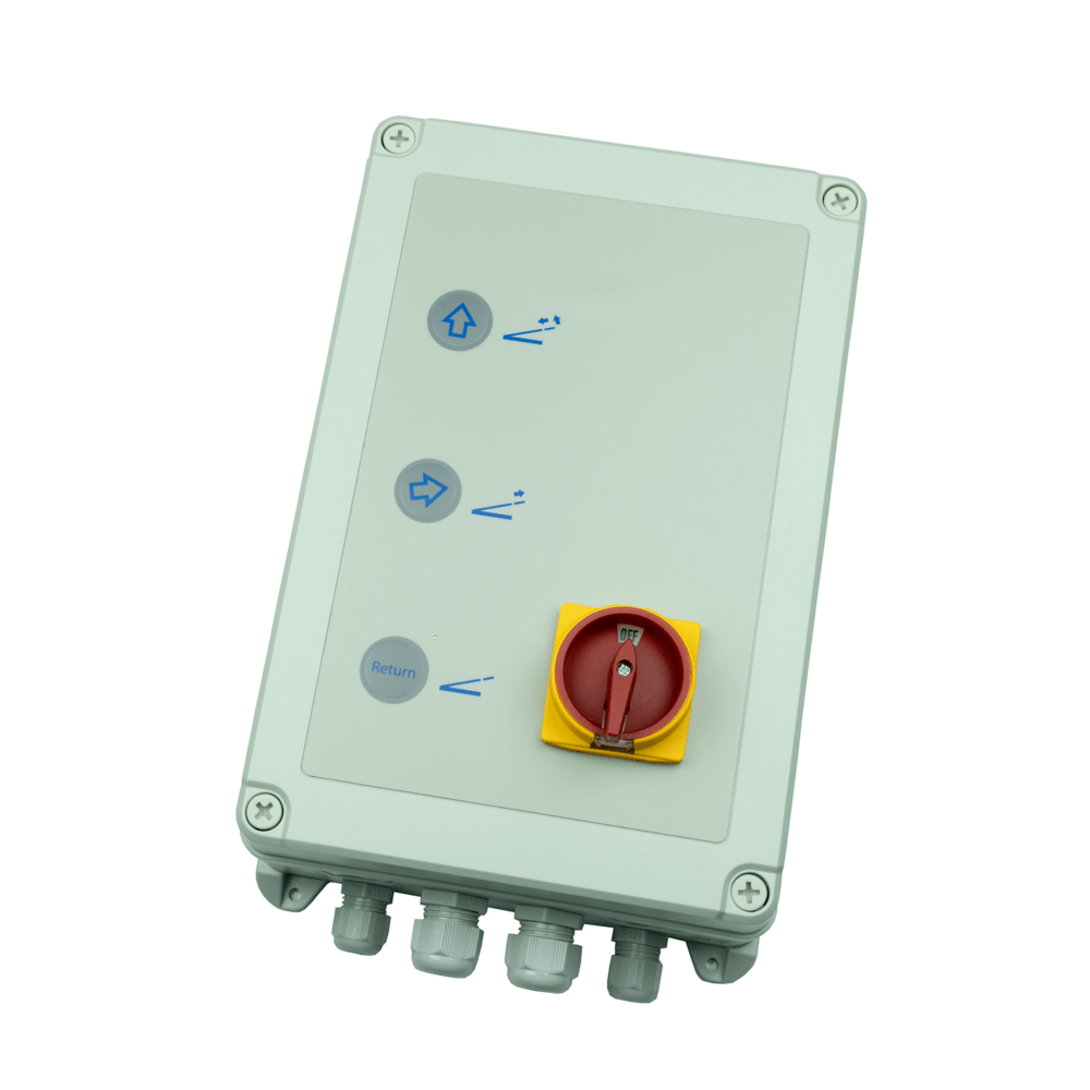 Universal feed control for dock levelers with telescopic lip. Designed for 2 solenoid valve systems and equipped with 3-button operation for precise, safe and controlled loading processes.